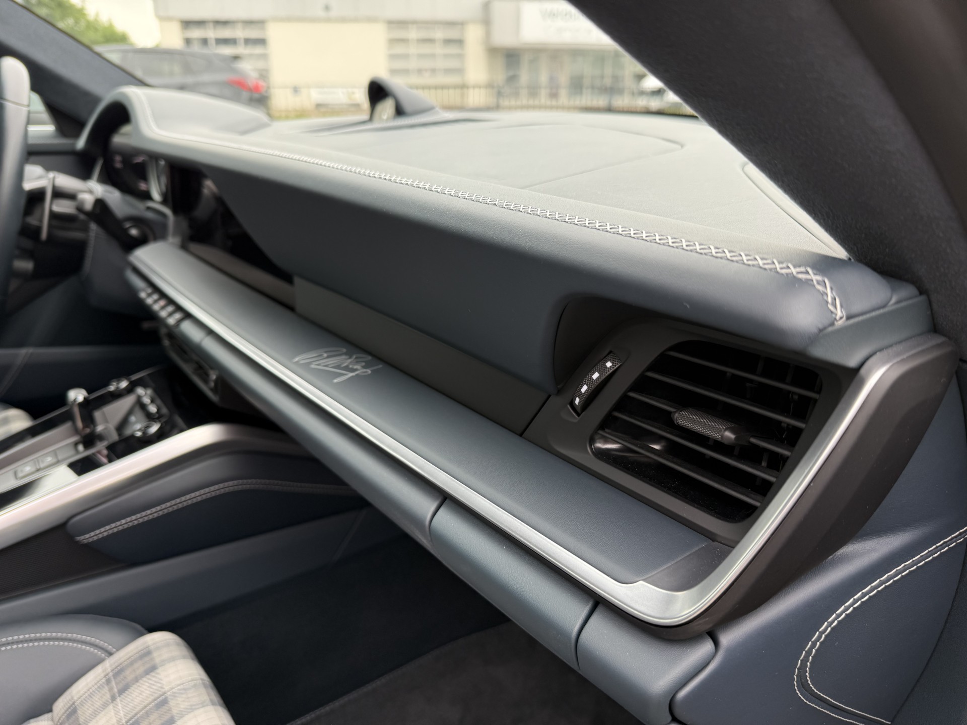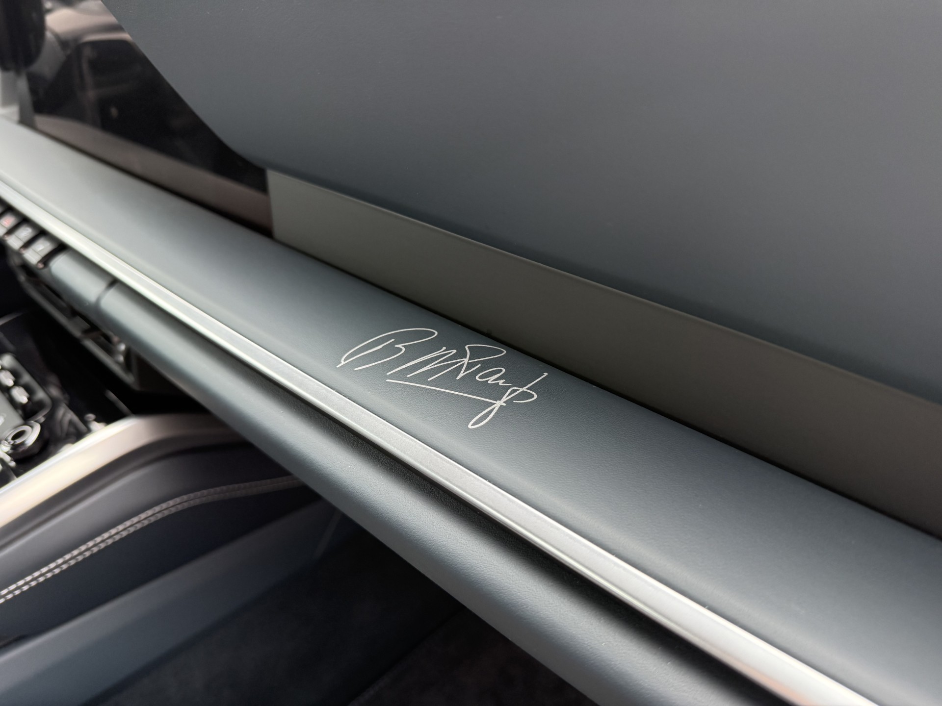 Deze unieke 911 Carrera 4S is uitgevoerd in een exclusief lederen interieur in Grafietblauw en stiksels in GT-zilver. Het dashboard en de verlichte Ben Pon jr.’-dorpellijsten van donker aluminium zijn voorzien van de handtekening van de succesvolle entrepreneur. De achterzijde van de verwarmbare Adaptieve sportstoelen Plus is bekleed met blauw leer. De speciale vloermatten zijn met hetzelfde leer afgebiesd. De ‘Ben Pon jr.’ heeft daarnaast diverse bijzondere accenten, zoals de hemelbekleding en zonnekleppen in Race-Tex, een hoogwaardig microvezelmateriaal dat gedeeltelijk is gemaakt van gerecyclede polyestervezels. Het standaard GT-sportstuurwiel heeft stuurverwarming